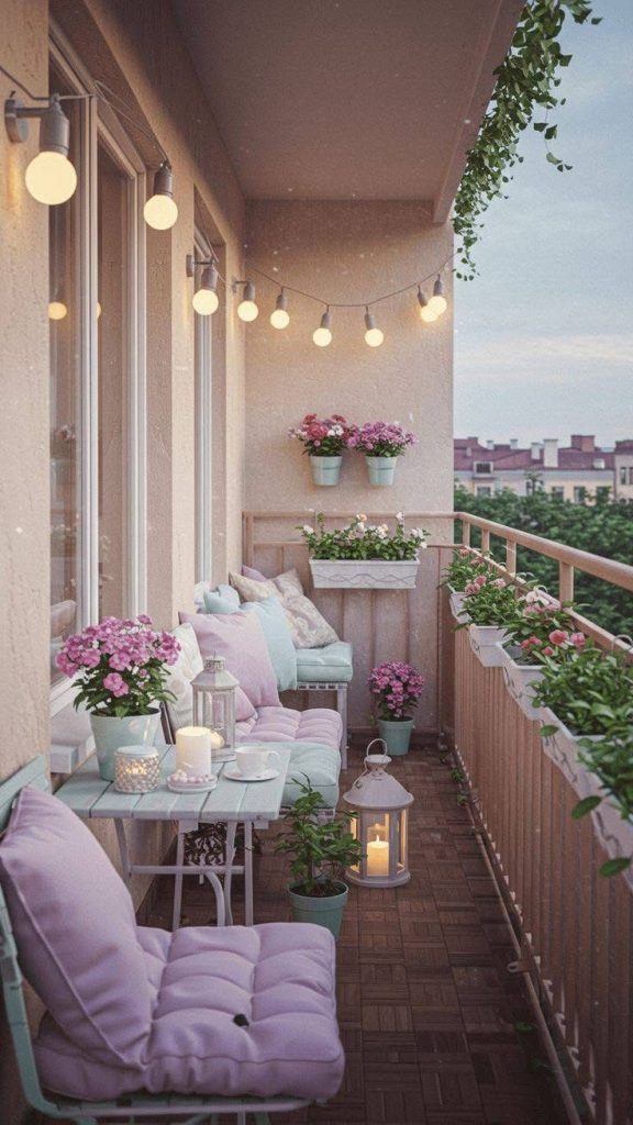 Важный акцент: освещение. Вечером твой балкон должен превращаться в сказку. Используй гирлянды с теплым светом (лампочки Эдисона), свечи в безопасных высоких подсвечниках или фонари на солнечных батареях. Мягкий свет скрывает недостатки ремонта и создает интимную атмосфреу.