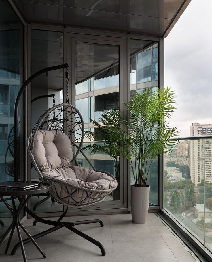 Добавь пару высоких барных стульев — и у тебя готово идеальное место для вечернего бокала вина с подругой или утреннего круассана. Это выглядит очень современно и существенно экономит пространство, оставляя центр балкона свободным.