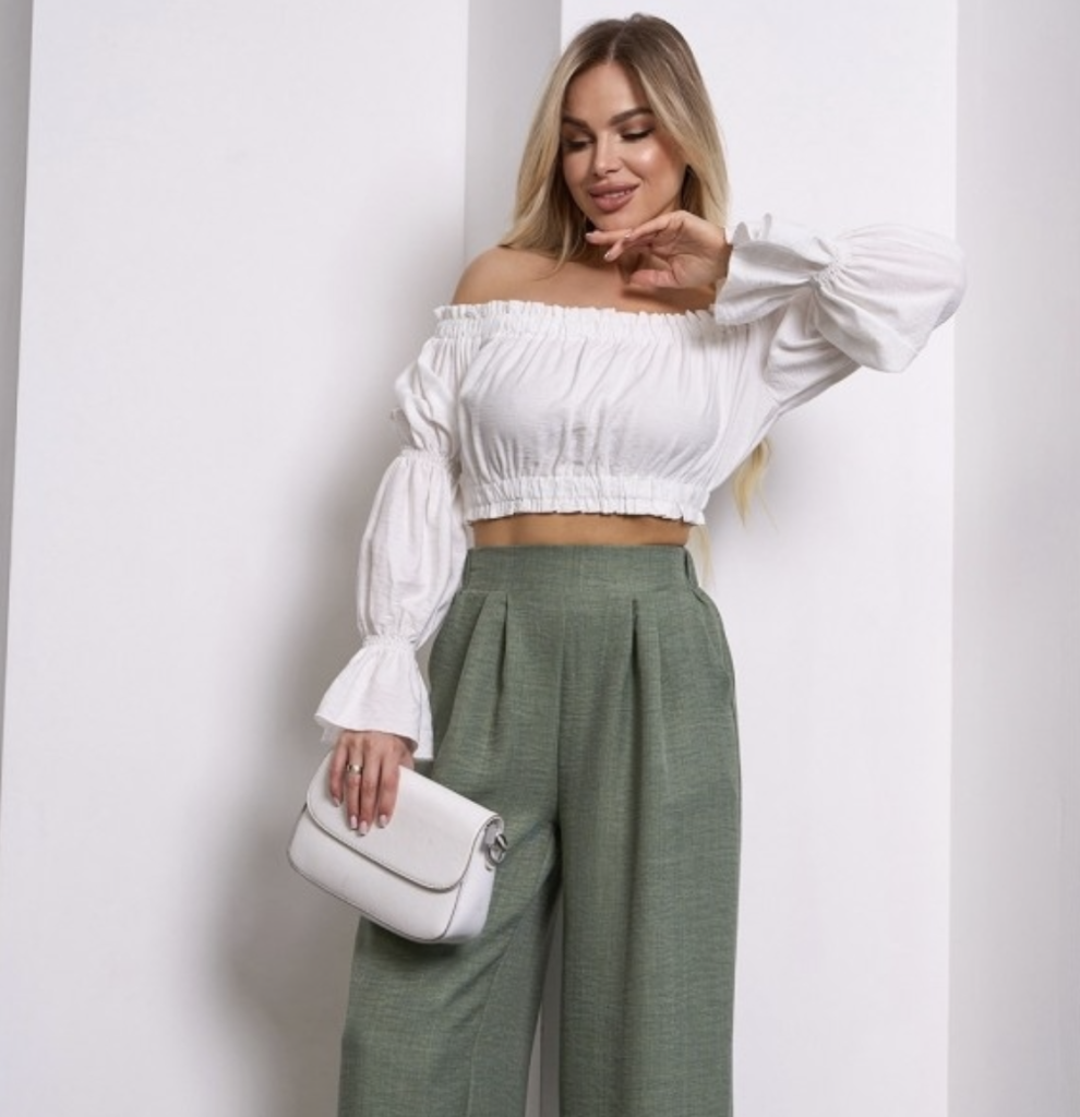 - Wide-leg (широкие брюки): Палаццо или кюлоты из легких, струящихся тканей. Они полностью скрывают линию бедра, создавая единую вертикаль от талии.